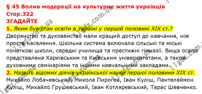 § 45 Вплив модерації на культурне життя українців Стор.322 ЗГАДАЙТЕ 1. Яким був стан освіти в Україні у першій половині XIX ст.? Дворянство та духовенство мали кращий доступ до навчання, ніж просте населення. Шкільна система включала сільські та міські початкові школи, середні училища та престижні гімназії. Вища освіта представлена Харківським та Київським університетами, а також духовними семінаріями та іншими навчальними закладами. 2. Назвіть відомих діячів української науки першої половини XIX ст. Михайло Лобачевський, Микола Пирогов, Іван Куліш, Пантелеймон Куліш, Михайло Грушевський, Іван Котляревський, Тарас Шевченко.