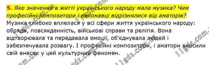 Яке значення в житті українського народу мала музика? Чим професійні композитори і виконавці відрізнялися від аматорів? Музика глибоко вплелася у всі сфери життя українського народу: обряди, повсякденність, військові справи та релігія. Вона відтворювала та передавала емоції, об'єднувала людей і забезпечувала розвагу. І професійні композитори, і аматори вносили свій внесок у цей культурний феномен.