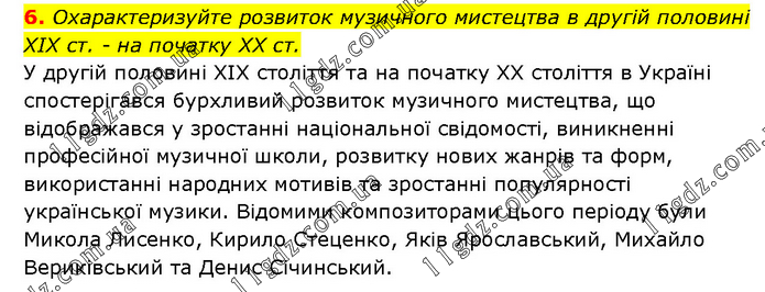 Охарактеризуйте розвиток музичного мистецтва в другій половині ХІХ ст. - на початку XX ст. У другій половині XIX століття та на початку XX століття в Україні спостерігався бурхливий розвиток музичного мистецтва, що відображався у зростанні національної свідомості, виникненні професійної музичної школи, розвитку нових жанрів та форм, використанні народних мотивів та зростанні популярності української музики. Відомими композиторами цього періоду були Микола Лисенко, Кирило Стеценко, Яків Ярославський, Михайло Вериківський та Денис Січинський.