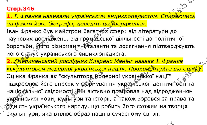 1. І. Франка називали українським енциклопедистом. Спираючись на факти його біографії, доведіть це твердження. Іван Франко був майстром багатьох сфер: від літератури до наукових досліджень, від громадської діяльності до політичної боротьби. Його різноманітні таланти та досягнення підтверджують його статус українського енциклопедиста. 2. Американський дослідник Клеренс Манінг назвав І. Франка «скульптором модерної української нації». Прокоментуйте цю оцінку. Оцінка Франка як "скульптора модерної української нації" підкреслює його внесок у формування української ідентичності та національної свідомості. Він активно працював над відродженням української мови, культури та історії, а також боровся за права та гідність українського народу, що робить його схожим на творця скульптури, яка втілює образ нації в сучасному світлі.