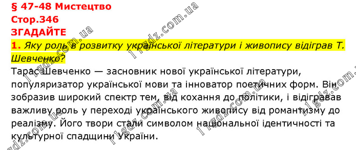 § 47-48 Мистецтво Стор.346 ЗГАДАЙТЕ 1. Яку роль в розвитку української літератури і живопису відіграв Т. Шевченко? Тарас Шевченко — засновник нової української літератури, популяризатор української мови та інноватор поетичних форм. Він зобразив широкий спектр тем, від кохання до політики, і відігравав важливу роль у переході українського живопису від романтизму до реалізму. Його твори стали символом національної ідентичності та культурної спадщини України.