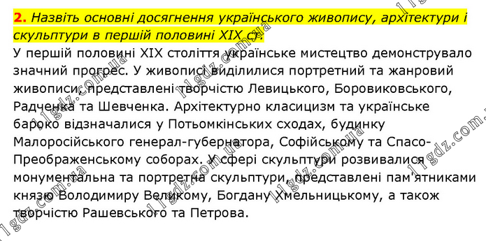 Назвіть основні досягнення українського живопису, архітектури і скульптури в першій половині XIX ст. У першій половині XIX століття українське мистецтво демонструвало значний прогрес. У живописі виділилися портретний та жанровий живописи, представлені творчістю Левицького, Боровиковського, Радченка та Шевченка. Архітектурно класицизм та українське бароко відзначалися у Потьомкінських сходах, будинку Малоросійського генерал-губернатора, Софійському та Спасо-Преображенському соборах. У сфері скульптури розвивалися монументальна та портретна скульптури, представлені пам'ятниками князю Володимиру Великому, Богдану Хмельницькому, а також творчістю Рашевського та Петрова.