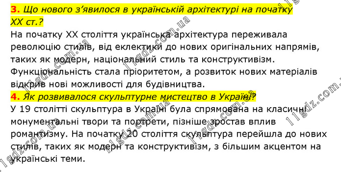 3. Що нового з’явилося в українській архітектурі на початку ХХ ст.? На початку XX століття українська архітектура переживала революцію стилів, від еклектики до нових оригінальних напрямів, таких як модерн, національний стиль та конструктивізм. Функціональність стала пріоритетом, а розвиток нових матеріалів відкрив нові можливості для будівництва. 4. Як розвивалося скульптурне мистецтво в Україні? У 19 столітті скульптура в Україні була спрямована на класичні монументальні твори та портрети, пізніше зростав вплив романтизму. На початку 20 століття скульптура перейшла до нових стилів, таких як модерн та конструктивізм, з більшим акцентом на українські теми.