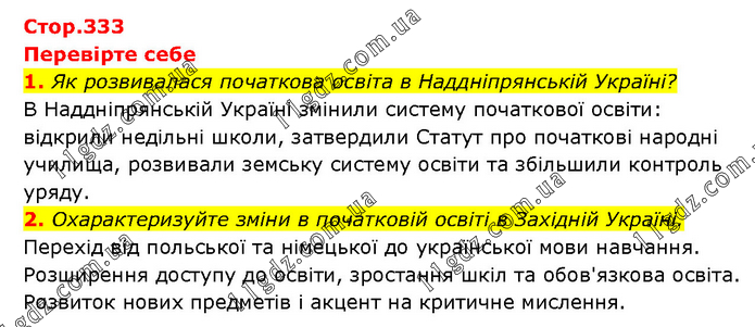 Перевірте себе 1. Як розвивалася початкова освіта в Наддніпрянській Україні? В Наддніпрянській Україні змінили систему початкової освіти: відкрили недільні школи, затвердили Статут про початкові народні училища, розвивали земську систему освіти та збільшили контроль уряду. 2. Охарактеризуйте зміни в початковій освіті в Західній Україні. Перехід від польської та німецької до української мови навчання. Розширення доступу до освіти, зростання шкіл та обов'язкова освіта. Розвиток нових предметів і акцент на критичне мислення.
