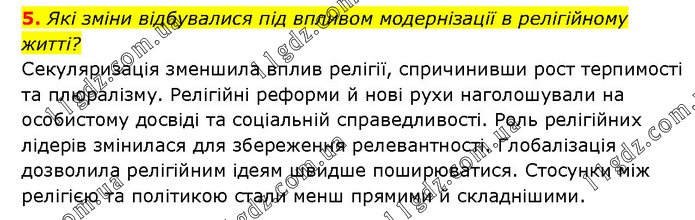 Які зміни відбувалися під впливом модернізації в релігійному житті? Секуляризація зменшила вплив релігії, спричинивши рост терпимості та плюралізму. Релігійні реформи й нові рухи наголошували на особистому досвіді та соціальній справедливості. Роль релігійних лідерів змінилася для збереження релевантності. Глобалізація дозволила релігійним ідеям швидше поширюватися. Стосунки між релігією та політикою стали менш прямими й складнішими.