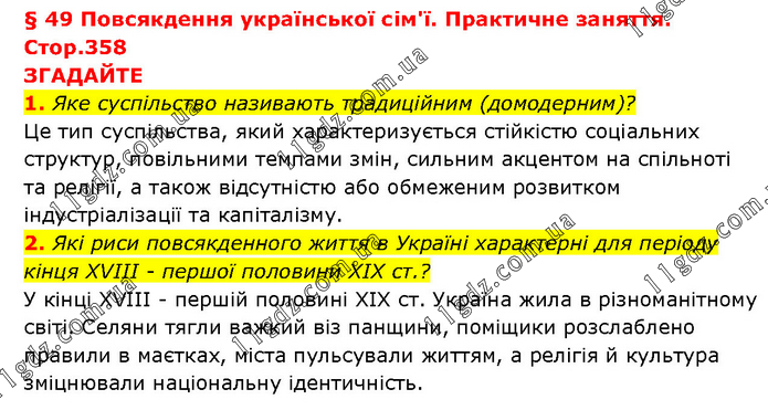 § 49 Повсякдення української сім'ї. Практичне заняття. Стор.358 ЗГАДАЙТЕ 1. Яке суспільство називають традиційним (домодерним)? Це тип суспільства, який характеризується стійкістю соціальних структур, повільними темпами змін, сильним акцентом на спільноті та релігії, а також відсутністю або обмеженим розвитком індустріалізації та капіталізму. 2. Які риси повсякденного життя в Україні характерні для періоду кінця XVIII - першої половини XIX ст.? У кінці XVIII - першій половині XIX ст. Україна жила в різноманітному світі. Селяни тягли важкий віз панщини, поміщики розслаблено правили в маєтках, міста пульсували життям, а релігія й культура зміцнювали національну ідентичність.