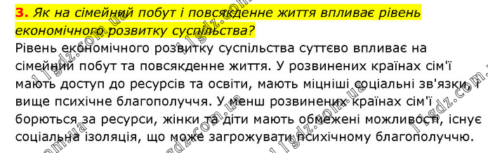 Як на сімейний побут і повсякденне життя впливає рівень економічного розвитку суспільства? Рівень економічного розвитку суспільства суттєво впливає на сімейний побут та повсякденне життя. У розвинених країнах сім'ї мають доступ до ресурсів та освіти, мають міцніші соціальні зв'язки, і вище психічне благополуччя. У менш розвинених країнах сім'ї борються за ресурси, жінки та діти мають обмежені можливості, існує соціальна ізоляція, що може загрожувати психічному благополуччю.