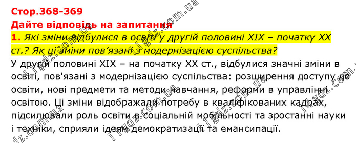 Дайте відповідь на запитання 1. Які зміни відбулися в освіті у другій половині ХІХ – початку ХХ ст.? Як ці зміни пов’язані з модернізацією суспільства? У другій половині ХІХ – на початку ХХ ст., відбулися значні зміни в освіті, пов'язані з модернізацією суспільства: розширення доступу до освіти, нові предмети та методи навчання, реформи в управлінні освітою. Ці зміни відображали потребу в кваліфікованих кадрах, підсилювали роль освіти в соціальній мобільності та зростанні науки і техніки, сприяли ідеям демократизації та емансипації.