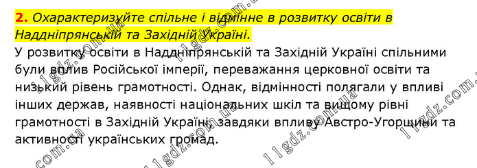 Охарактеризуйте спільне і відмінне в розвитку освіти в Наддніпрянській та Західній Україні. У розвитку освіти в Наддніпрянській та Західній Україні спільними були вплив Російської імперії, переважання церковної освіти та низький рівень грамотності. Однак, відмінності полягали у впливі інших держав, наявності національних шкіл та вищому рівні грамотності в Західній Україні, завдяки впливу Австро-Угорщини та активності українських громад.