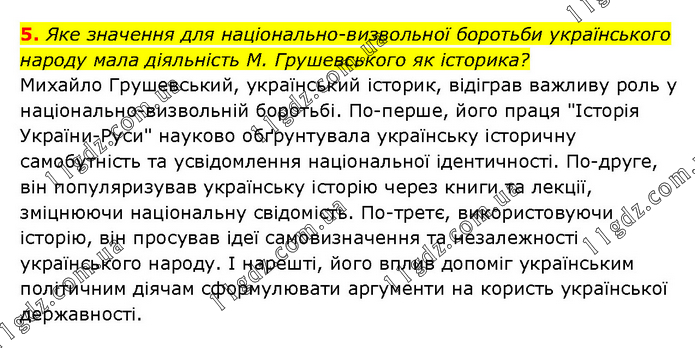 Яке значення для національно-визвольної боротьби українського народу мала діяльність М. Грушевського як історика? Михайло Грушевський, український історик, відіграв важливу роль у національно-визвольній боротьбі. По-перше, його праця "Історія України-Руси" науково обґрунтувала українську історичну самобутність та усвідомлення національної ідентичності. По-друге, він популяризував українську історію через книги та лекції, зміцнюючи національну свідомість. По-третє, використовуючи історію, він просував ідеї самовизначення та незалежності українського народу. І нарешті, його вплив допоміг українським політичним діячам сформулювати аргументи на користь української державності.