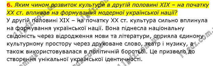 Яким чином розвиток культури в другій половині ХІХ – на початку ХХ ст. впливав на формування модерної української нації? У другій половині ХІХ – на початку ХХ ст. культура сильно вплинула на формування української нації. Вона піднесла національну свідомість через відродження мови та літератури, сприяла єдиному культурному простору через друковане слово, театр і музику, а також використовувалася в політичній боротьбі. Це призвело до створення унікальної української ідентичності.