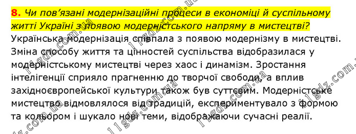 Чи пов’язані модернізаційні процеси в економіці й суспільному житті Україні з появою модерністського напряму в мистецтві? Українська модернізація співпала з появою модернізму в мистецтві. Зміна способу життя та цінностей суспільства відобразилася у модерністському мистецтві через хаос і динамізм. Зростання інтелігенції сприяло прагненню до творчої свободи, а вплив західноєвропейської культури також був суттєвим. Модерністське мистецтво відмовлялося від традицій, експериментувало з формою та кольором і шукало нові теми, відображаючи сучасні реалії.
