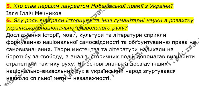 5. Хто став першим лауреатом Нобелівської премії з України? Ілля Ілліч Мечников 6. Яку роль відіграли історична та інші гуманітарні науки в розвитку українськогонаціонально-визвольного руху? Дослідження історії, мови, культури та літератури сприяли формуванню національної самосвідомості та обґрунтуванню права на самовизначення. Твори мистецтва та літератури надихали на боротьбу за свободу, а аналіз історичних подій допомагав визначити стратегію й тактику руху. На основі знань та досвіду інших національно-визвольних рухів український народ згуртувався навколо спільної мети – незалежності.