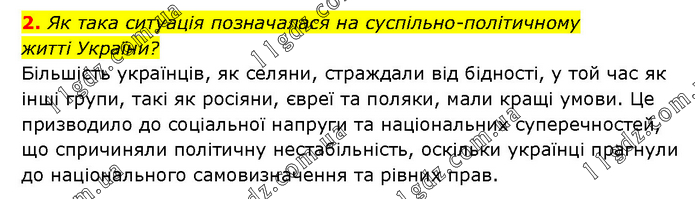 Як така ситуація позначалася на суспільно-політичному житті України? Більшість українців, як селяни, страждали від бідності, у той час як інші групи, такі як росіяни, євреї та поляки, мали кращі умови. Це призводило до соціальної напруги та національних суперечностей, що спричиняли політичну нестабільність, оскільки українці прагнули до національного самовизначення та рівних прав.