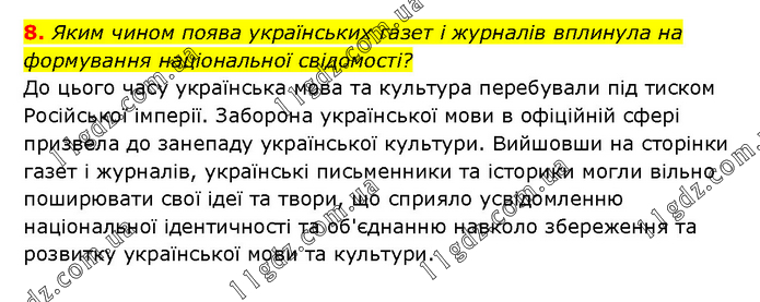Яким чином поява українських газет і журналів вплинула на формування національної свідомості? До цього часу українська мова та культура перебували під тиском Російської імперії. Заборона української мови в офіційній сфері призвела до занепаду української культури. Вийшовши на сторінки газет і журналів, українські письменники та історики могли вільно поширювати свої ідеї та твори, що сприяло усвідомленню національної ідентичності та об'єднанню навколо збереження та розвитку української мови та культури.