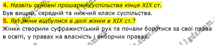 4. Назвіть основні прошарки суспільства кінця ХІХ ст. Був вищий, середній та нижчий класи суспільства. 5. Які зміни відбулися в долі жінки в ХІХ ст.? Жінки створили суфражистський рух та почали боротися за свої права в освіті, у правах на власність і виборчих правах.