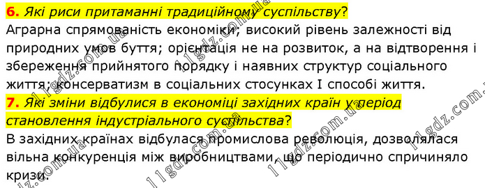 6. Які риси притаманні традиційному суспільству? Аграрна спрямованість економіки; високий рівень залежності від природних умов буття; орієнтація не на розвиток, а на відтворення і збереження прийнятого порядку і наявних структур соціального життя; консерватизм в соціальних стосунках І способі життя. 7. Які зміни відбулися в економіці західних країн у період становлення індустріального суспільства? В західних країнах відбулася промислова революція, дозволялася вільна конкуренція між виробництвами, що періодично спричиняло кризи.