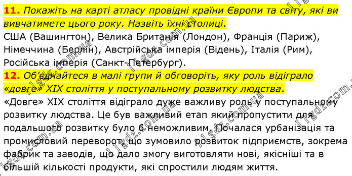 11. Покажіть на карті атласу провідні країни Європи та світу, які ви вивчатимете цього року. Назвіть їхні столиці. США (Вашингтон), Велика Британія (Лондон), Франція (Париж), Німеччина (Берлін), Австрійська імперія (Відень), Італія (Рим), Російська імперія (Санкт-Петербург). 12. Об’єднайтеся в малі групи й обговоріть, яку роль відіграло «довге» XIX століття у поступальному розвитку людства. «Довге» XIX століття відіграло дуже важливу роль у поступальному розвитку людства. Це був важливий етап який пропустити для подальшого розвитку було б неможливим. Почалася урбанізація та промисловий переворот, що зумовило розвиток підприємств, зокрема фабрик та заводів, що дало змогу виготовляти нові, якісніші та в більшій кількості продукти, які спростили людям життя.