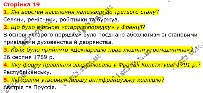 Сторінка 19 1. Які верстви населення належали до третього стану? Селяни, ремісники, робітники та буржуа. 2. Що було в основі «старого порядку» у Франції? В основі «старого порядку» було поєднано абсолютизм зі становими привілеями духовенства й дворянства. 3. Коли було прийнято «Декларацію прав людини і громадянина»? 26 серпня 1789 р. 4. Яку форму правління закріплювала у Франції Конституція 1791 р.? Республіканську. 5. Які країни утворили першу антифранцузьку коаліцію? Австрія та Пруссія.