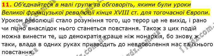 Об’єднайтеся в малі групи та обговоріть, якими були уроки Великої французької революції кінця XVIII ст. для тогочасної Європи. Уроком революції стало розуміння того, що терор це не вихід, і рано чи пізно внаслідок нього станеться повстання. Також з цих подій можна винести те, що демократія краще ніж монархія, бо знову ж таки, влада в одних руках призводить до невдоволення мас та їхнього повстання.