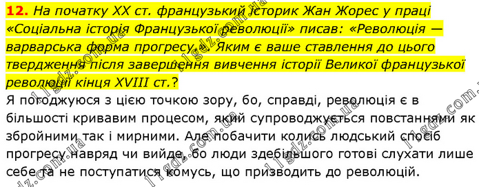 На початку XX ст. французький історик Жан Жорес у праці «Соціальна історія Французької революції» писав: «Революція — варварська форма прогресу.». Яким є ваше ставлення до цього твердження після завершення вивчення історії Великої французької революції кінця XVIII ст.? Я погоджуюся з цією точкою зору, бо, справді, революція є в більшості кривавим процесом, який супроводжується повстаннями як збройними так і мирними. Але побачити колись людський спосіб прогресу навряд чи вийде, бо люди здебільшого готові слухати лише себе та не поступатися комусь, що призводить до революцій.