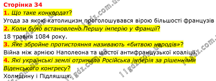 1. Що таке конкордат? Угода за якою католицизм проголошувався вірою більшості французів 2. Коли було встановлено Першу імперію у Франції? 18 травня 1084 року. 3. Яке збройне протистояння називають «битвою народів»? Війна між армією Наполеона та шостої антифранцузької коаліції. 4. Які українські землі отримала Російська імперія за рішеннями Віденського конгресу? Холмщину і Підляшшя.