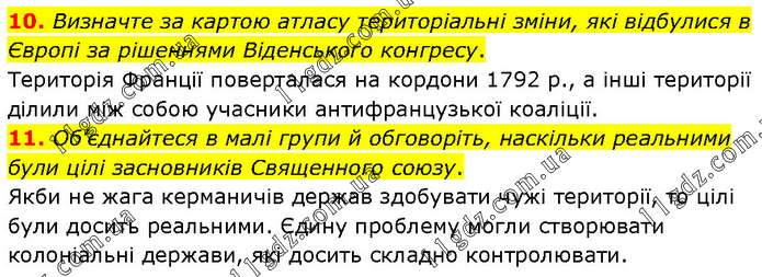 10. Визначте за картою атласу територіальні зміни, які відбулися в Європі за рішеннями Віденського конгресу. Територія Франції поверталася на кордони 1792 р., а інші території ділили між собою учасники антифранцузької коаліції. 11. Об’єднайтеся в малі групи й обговоріть, наскільки реальними були цілі засновників Священного союзу. Якби не жага керманичів держав здобувати чужі території, то цілі були досить реальними. Єдину проблему могли створювати колоніальні держави, які досить складно контролювати.