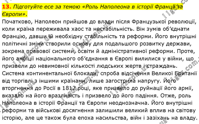 Підготуйте есе за темою «Роль Наполеона в історії Франції та Європи». Початково, Наполеон прийшов до влади після Французької революції, коли країна переживала хаос та нестабільність. Він зумів об’єднати Францію, давши їй необхідну стабільність та реформи. Його внутрішні політичні зміни створили основу для подальшого розвитку держави, зокрема правової системи, освіти й адміністративної реформи. Проте, його амбіції національного об’єднання в Європі вилилися у війни, що призвели до невимовної кількості людських жертв і страждань. Система континентальної блокади, спроба відсічення Великої Британії від торгівлі з іншими країнами, лише загострила напругу. Його вторгнення до Росії в 1812 році, яке призвело до руйнації його армії, вказало на його вразливість і призвело до його падіння. Отже, роль Наполеона в історії Франції та Європи неоднозначна. Його внутрішні реформи та військові досягнення залишили великий вплив на світову історію, але це також була епоха насильства, війн і зазіхань на владу.
