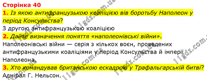 1. Із якою антифранцузькою коаліцією вів боротьбу Наполеон у період Консульства? З другою антифранцузькою коаліцією 2. Дайте визначення поняття «наполеонівські війни». Наполеонівські війни — серія з кількох воєн, проведених антифранцузькими коаліціями у період Консульства й імперії Наполеона. 3. Хто командував британською ескадрою у Трафальгарській битві? Адмірал Г. Нельсон.