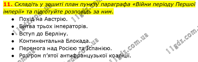 Складіть у зошиті план пункту параграфа «Війни періоду Першої імперії» та підготуйте розповідь за ним. ● Похід на Австрію. ● Битва трьох імператорів. ● Вступ до Берліну. ● Континентальна Блокада. ● Перемога над Росією та Іспанією. ● Розгром п’ятої антифранцузької коаліції.