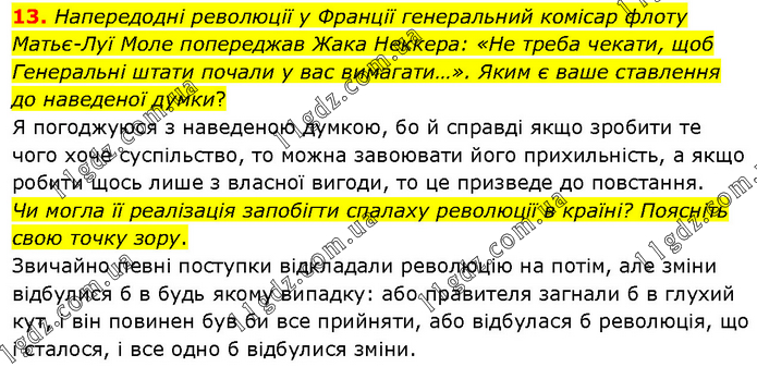 Напередодні революції у Франції генеральний комісар флоту Матьє-Луї Моле попереджав Жака Неккера: «Не треба чекати, щоб Генеральні штати почали у вас вимагати…». Яким є ваше ставлення до наведеної думки? Я погоджуюся з наведеною думкою, бо й справді якщо зробити те чого хоче суспільство, то можна завоювати його прихильність, а якщо робити щось лише з власної вигоди, то це призведе до повстання. Чи могла її реалізація запобігти спалаху революції в країні? Поясніть свою точку зору. Звичайно певні поступки відкладали революцію на потім, але зміни відбулися б в будь якому випадку: або правителя загнали б в глухий кут, і він повинен був би все прийняти, або відбулася б революція, що і сталося, і все одно б відбулися зміни.