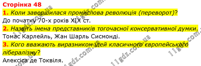 1. Коли завершилася промислова революція (переворот)? До початку 70-х років XIX ст. 2. Назвіть імена представників тогочасної консервативної думки. Томас Карлейль, Жан Шарль Сисмонді. 3. Кого вважають виразником ідей класичного європейського лібералізму? Алексіса де Токвіля.