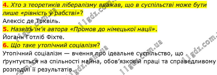 4. Хто з теоретиків лібералізму вважав, що в суспільстві може бути лише «рівність у рабстві»? Алексіс де Токвіль. 5. Назвіть ім’я автора «Промов до німецької нації». Йоганн Готліб Фіхте. 6. Що таке утопічний соціалізм? Утопічний соціалізм — вчення про ідеальне суспільство, що ґрунтується на спільності майна, обов’язковій праці та справедливому розподілі її результатів.