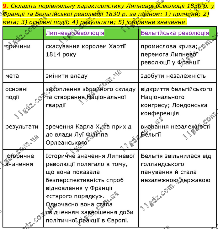 Складіть порівняльну характеристику Липневої революції 1830 р. у Франції та Бельгійської революції 1830 р. за планом: 1) причини; 2) мета; 3) основні події; 4) результати; 5) історичне значення.