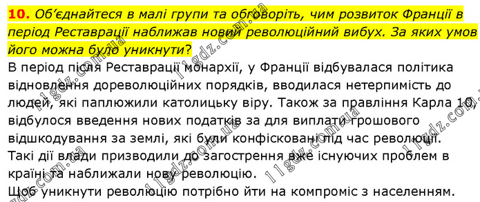 Об’єднайтеся в малі групи та обговоріть, чим розвиток Франції в період Реставрації наближав новий революційний вибух. За яких умов його можна було уникнути? В період після Реставрації монархії, у Франції відбувалася політика відновлення дореволюційних порядків, вводилася нетерпимість до людей, які паплюжили католицьку віру. Також за правління Карла 10, відбулося введення нових податків за для виплати грошового відшкодування за землі, які були конфісковані під час революції. Такі дії влади призводили до загострення вже існуючих проблем в країні та наближали нову революцію. Щоб уникнути революцію потрібно йти на компроміс з населенням.
