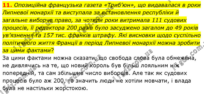Опозиційна французька газета «Триб’юн», що видавалася в роки Липневої монархії та виступала за встановлення республіки й загальне виборче право, за чотири роки витримала 111 судових процесів, її редактора 200 разів було засуджено загалом до 49 років ув’язнення та 157 тис. франків штрафу. Які висновки щодо суспільно політичного життя Франції в період Липневої монархії можна зробити за цими фактами? За цими фактами можна сказати, що свобода слова була обмежена, не дивлячись на те, що новий король був більш лояльним ніж попередній, та сам збільшив число виборців. Але так як судових процесів було аж 200, то значить люди не хотіли мовчати, і влада була не настільки жорстокою.