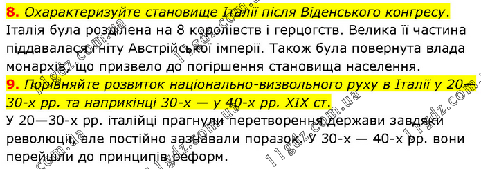 8. Охарактеризуйте становище Італії після Віденського конгресу. Італія була розділена на 8 королівств і герцогств. Велика її частина піддавалася гніту Австрійської імперії. Також була повернута влада монархів, що призвело до погіршення становища населення. 9. Порівняйте розвиток національно-визвольного руху в Італії у 20—30-х рр. та наприкінці 30-х — у 40-х рр. XIX ст. У 20—30-х рр. італійці прагнули перетворення держави завдяки революції, але постійно зазнавали поразок. У 30-х — 40-х рр. вони перейшли до принципів реформ.