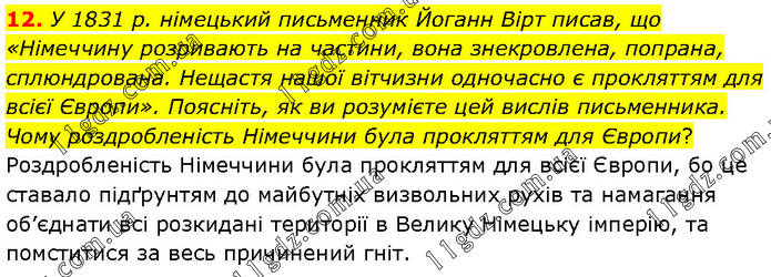У 1831 р. німецький письменник Йоганн Вірт писав, що «Німеччину розривають на частини, вона знекровлена, попрана, сплюндрована. Нещастя нашої вітчизни одночасно є прокляттям для всієї Європи». Поясніть, як ви розумієте цей вислів письменника. Чому роздробленість Німеччини була прокляттям для Європи? Роздробленість Німеччини була прокляттям для всієї Європи, бо це ставало підґрунтям до майбутніх визвольних рухів та намагання об’єднати всі розкидані території в Велику Німецьку імперію, та помститися за весь причинений гніт.
