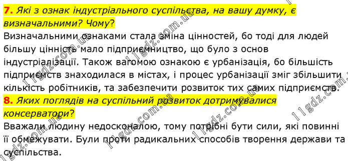 7. Які з ознак індустріального суспільства, на вашу думку, є визначальними? Чому? Визначальними ознаками стала зміна цінностей, бо тоді для людей більшу цінність мало підприємництво, що було з основ індустріалізації. Також вагомою ознакою є урбанізація, бо більшість підприємств знаходилася в містах, і процес урбанізації зміг збільшити кількість робітників, та забезпечити розвиток тих самих підприємств. 8. Яких поглядів на суспільний розвиток дотримувалися консерватори? Вважали людину недосконалою, тому потрібні бути сили, які повинні її обмежувати. Були проти радикальних способів творення держави та суспільства.