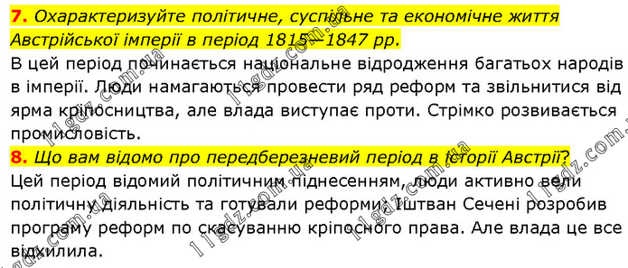 7. Охарактеризуйте політичне, суспільне та економічне життя Австрійської імперії в період 1815—1847 рр. В цей період починається національне відродження багатьох народів в імперії. Люди намагаються провести ряд реформ та звільнитися від ярма кріпосництва, але влада виступає проти. Стрімко розвивається промисловість. 8. Що вам відомо про передберезневий період в історії Австрії? Цей період відомий політичним піднесенням, люди активно вели політичну діяльність та готували реформи; Іштван Сечені розробив програму реформ по скасуванню кріпосного права. Але влада це все відхилила.