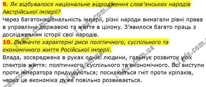 9. Як відбувалося національне відродження слов’янських народів Австрійської імперії? Через багатонаціональність імперії, різні народи вимагали рівні права в управлінні державою та життя в цілому. З’явилося багато праць з дослідженням історії свої народів. 10. Визначте характерні риси політичного, суспільного та економічного життя Російської імперії. Влада, зосереджена в руках однієї людини, гальмує розвиток усіх спектрів життя: політичного, суспільного та економічного. Всі виступи проти імператора придушуються; посилюється гніт проти кріпаків, через це економіка дуже повільно розвивається.