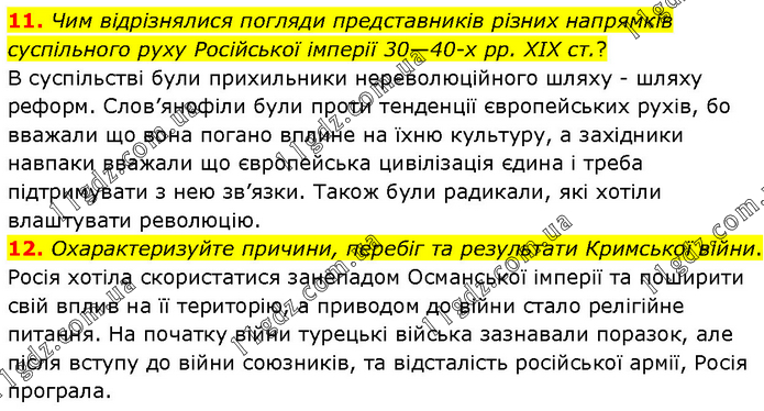11. Чим відрізнялися погляди представників різних напрямків суспільного руху Російської імперії 30—40х рр. XIX ст.? В суспільстві були прихильники нереволюційного шляху - шляху реформ. Слов’янофіли були проти тенденції європейських рухів, бо вважали що вона погано вплине на їхню культуру, а західники навпаки вважали що європейська цивілізація єдина і треба підтримувати з нею зв’язки. Також були радикали, які хотіли влаштувати революцію. 12. Охарактеризуйте причини, перебіг та результати Кримської війни. Росія хотіла скористатися занепадом Османської імперії та поширити свій вплив на її територію, а приводом до війни стало релігійне питання. На початку війни турецькі війська зазнавали поразок, але після вступу до війни союзників, та відсталість російської армії, Росія програла.
