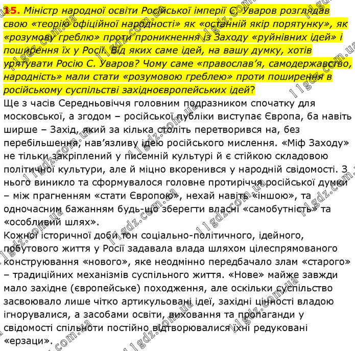 Міністр народної освіти Російської імперії С. Уваров розглядав свою «теорію офіційної народності» як «останній якір порятунку», як «розумову греблю» проти проникнення із Заходу «руйнівних ідей» і поширення їх у Росії. Від яких саме ідей, на вашу думку, хотів урятувати Росію С. Уваров? Чому саме «православ’я, самодержавство, народність» мали стати «розумовою греблею» проти поширення в російському суспільстві західноєвропейських ідей? Ще з часів Середньовіччя головним подразником спочатку для московської, а згодом – російської публіки виступає Європа, ба навіть ширше – Захід, який за кілька століть перетворився на, без перебільшення, нав’язливу ідею російського мислення. «Міф Заходу» не тільки закріплений у писемній культурі й є стійкою складовою політичної культури, але й міцно вкоренився у народній свідомості. З нього виникло та сформувалося головне протиріччя російської думки – між прагненням «стати Європою», нехай навіть «іншою», та одночасним бажанням будь-що зберегти власні «самобутність» та «особливий шлях». Кожної історичної доби тон соціально-політичного, ідейного, побутового життя у Росії задавала влада шляхом цілеспрямованого конструювання «нового», яке неодмінно передбачало злам «старого» – традиційних механізмів суспільного життя. «Нове» майже завжди мало західне (європейське) походження, але оскільки суспільство засвоювало лише чітко артикульовані ідеї, західні цінності владою ігнорувалися, а засобами освіти, виховання та пропаганди у свідомості спільноти постійно відтворювалися їхні редуковані «ерзаци».