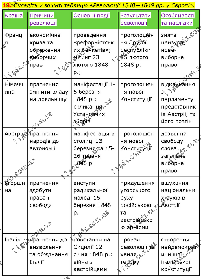 Складіть у зошиті таблицю «Революції 1848—1849 рр. у Європі».