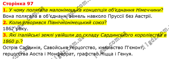 1. У чому полягала малонімецька концепція об’єднання Німеччини? Вона полягала в об’єднанні земель навколо Пруссії без Австрії. 2. Коли утворився Північнонімецький союз? 1867 року. 3. Які італійські землі увійшли до складу Сардинського королівства в 1860 р.? Острів Сардинія, Савойське герцогство, князівство П'ємонт, герцогства Аоста і Монферрат, графство Ніцца і Генуя.