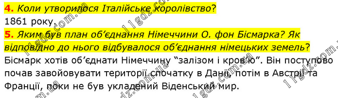 4. Коли утворилося Італійське королівство? 1861 року. 5. Яким був план об’єднання Німеччини О. фон Бісмарка? Як відповідно до нього відбувалося об’єднання німецьких земель? Бісмарк хотів об’єднати Німеччину “залізом і кров’ю”. Він поступово почав завойовувати території спочатку в Данії, потім в Австрії та Франції, поки не був укладений Віденський мир.
