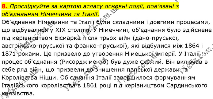 Прослідкуйте за картою атласу основні події, пов’язані з об’єднанням Німеччини та Італії. Об'єднання Німеччини та Італії були складними і довгими процесами, що відбувалися у XIX столітті. У Німеччині, об'єднання було здійснене під керівництвом Бісмарка після трьох війн (дано-пруської, австрійсько-пруської та франко-пруської), які відбулися між 1864 і 1871 роками. Це призвело до утворення Німецької імперії. У Італії процес об'єднання (Рисорджіменто) був дуже схожий. Він включав в себе ряд війн, що призвели до знищення папської держави та Королівства Ніцци. Об'єднання Італії завершилося формуванням Італійського королівства в 1861 році під керівництвом Сардинського князівства.