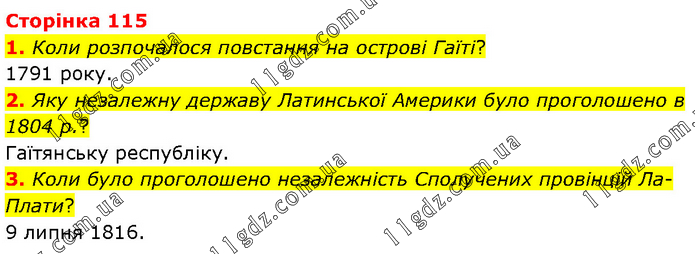 1. Коли розпочалося повстання на острові Гаїті? 1791 року. 2. Яку незалежну державу Латинської Америки було проголошено в 1804 р.? Гаїтянську республіку. 3. Коли було проголошено незалежність Сполучених провінцій Ла-Плати? 9 липня 1816.