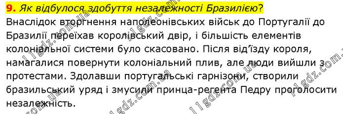 Як відбулося здобуття незалежності Бразилією? Внаслідок вторгнення наполеонівських військ до Португалії до Бразилії переїхав королівський двір, і більшість елементів колоніальної системи було скасовано. Після від’їзду короля, намагалися повернути колоніальний плив, але люди вийшли з протестами. Здолавши португальські гарнізони, створили бразильський уряд і змусили принца-регента Педру проголосити незалежність.