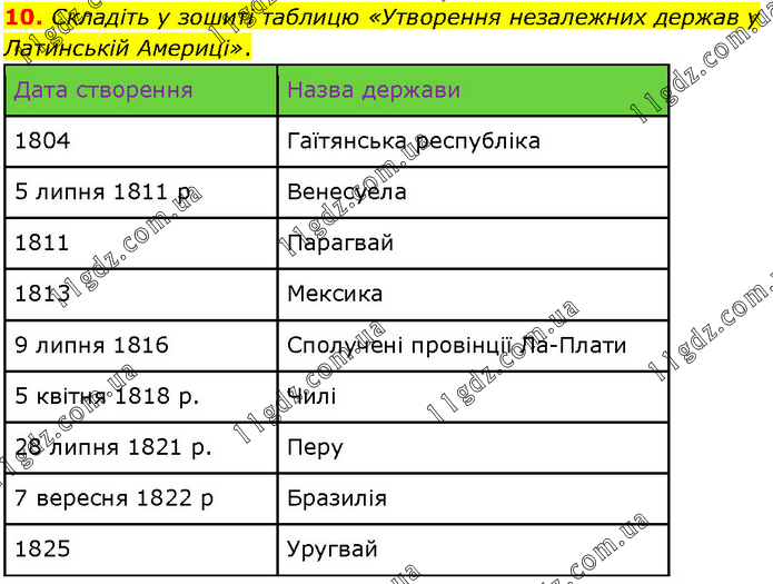 Складіть у зошиті таблицю «Утворення незалежних держав у Латинській Америці». Дата створення Назва держави 1804 Гаїтянська республіка 5 липня 1811 р Венесуела 1811 Парагвай 1813 Мексика 9 липня 1816 Сполучені провінції Ла-Плати 5 квітня 1818 р. Чилі 28 липня 1821 р. Перу 7 вересня 1822 р Бразилія 1825 Уругвай